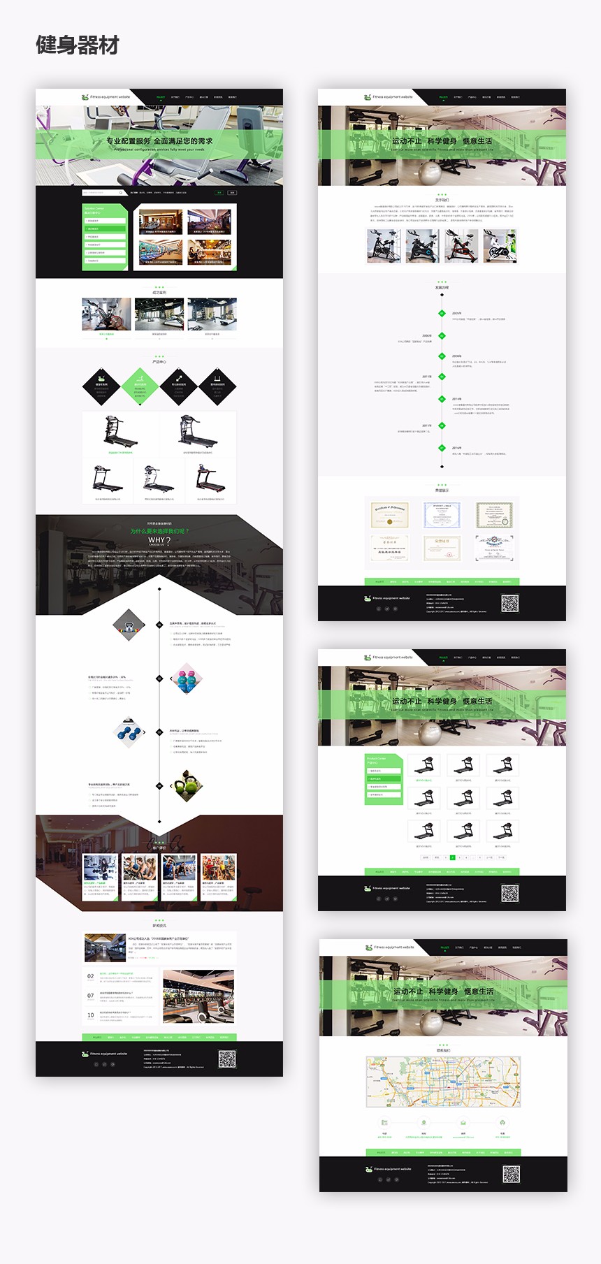 本套健身器材的模版选用了深灰色和绿色这两种颜色搭配作为主色调,绿色部分表达了环保、健康的理念,深灰色部分将页面衬托得更加大气时尚。