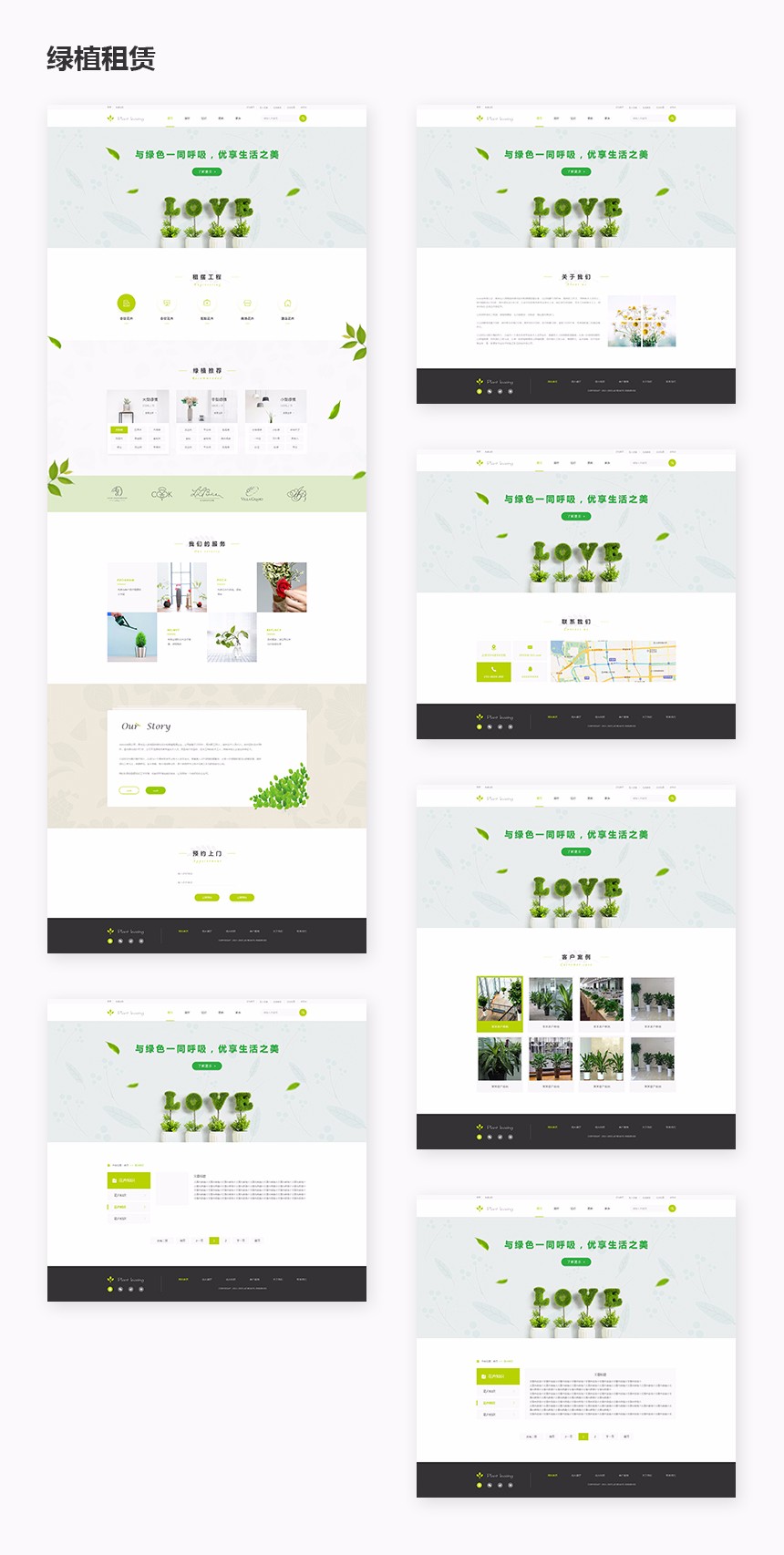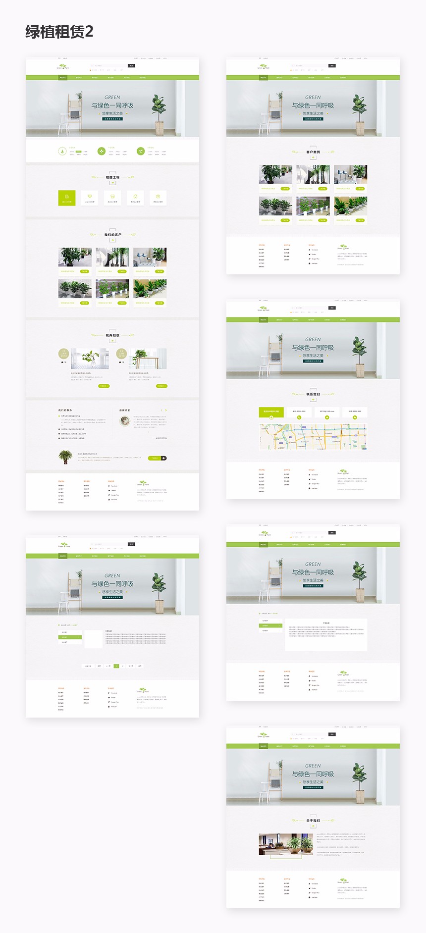 绿植租赁行业当然要选以绿色作为主题色,内容区块比较大,浏览信息比较方便,灰色相间的模块背景设计凸显出模板的简约大气及精细。